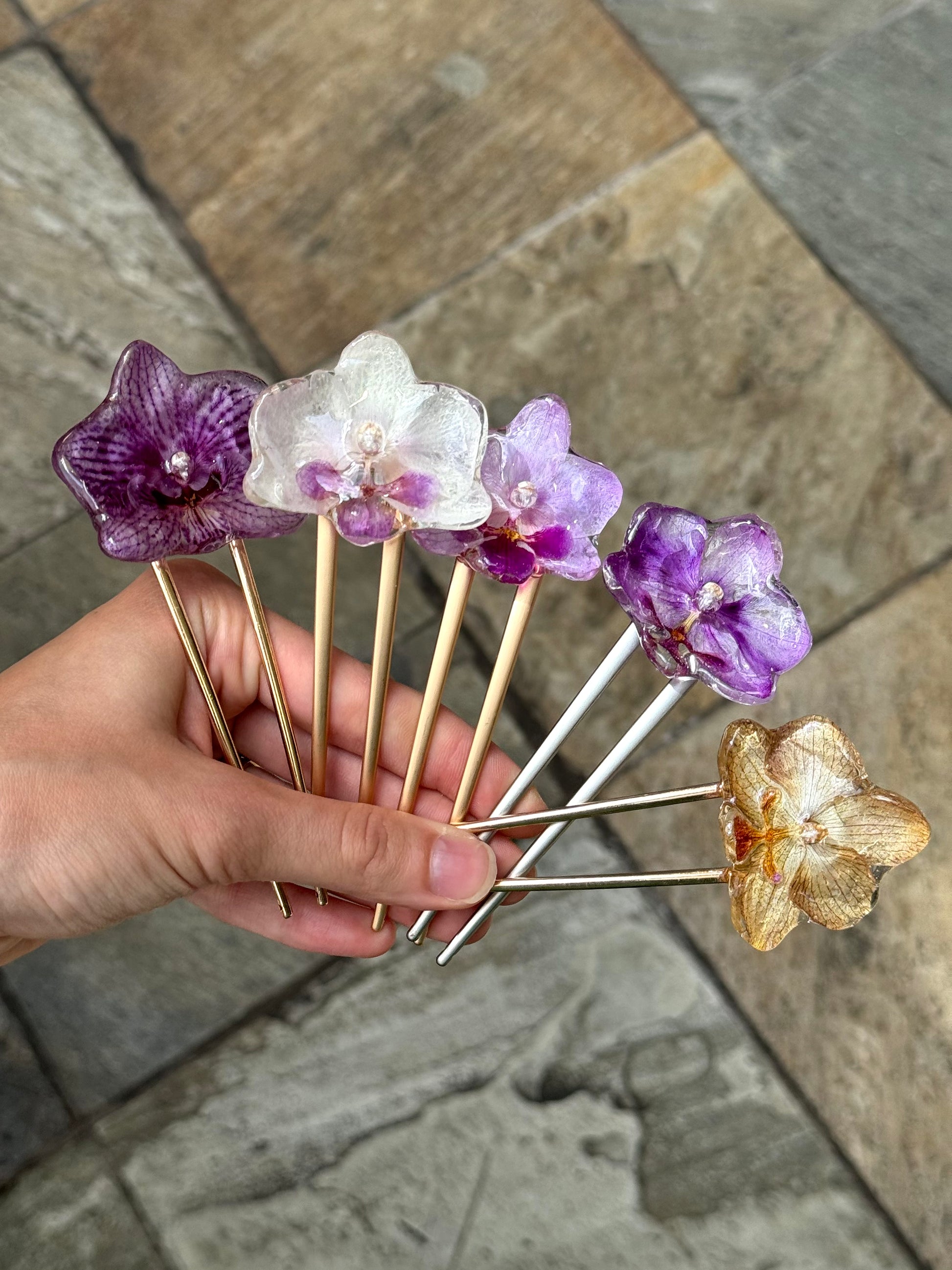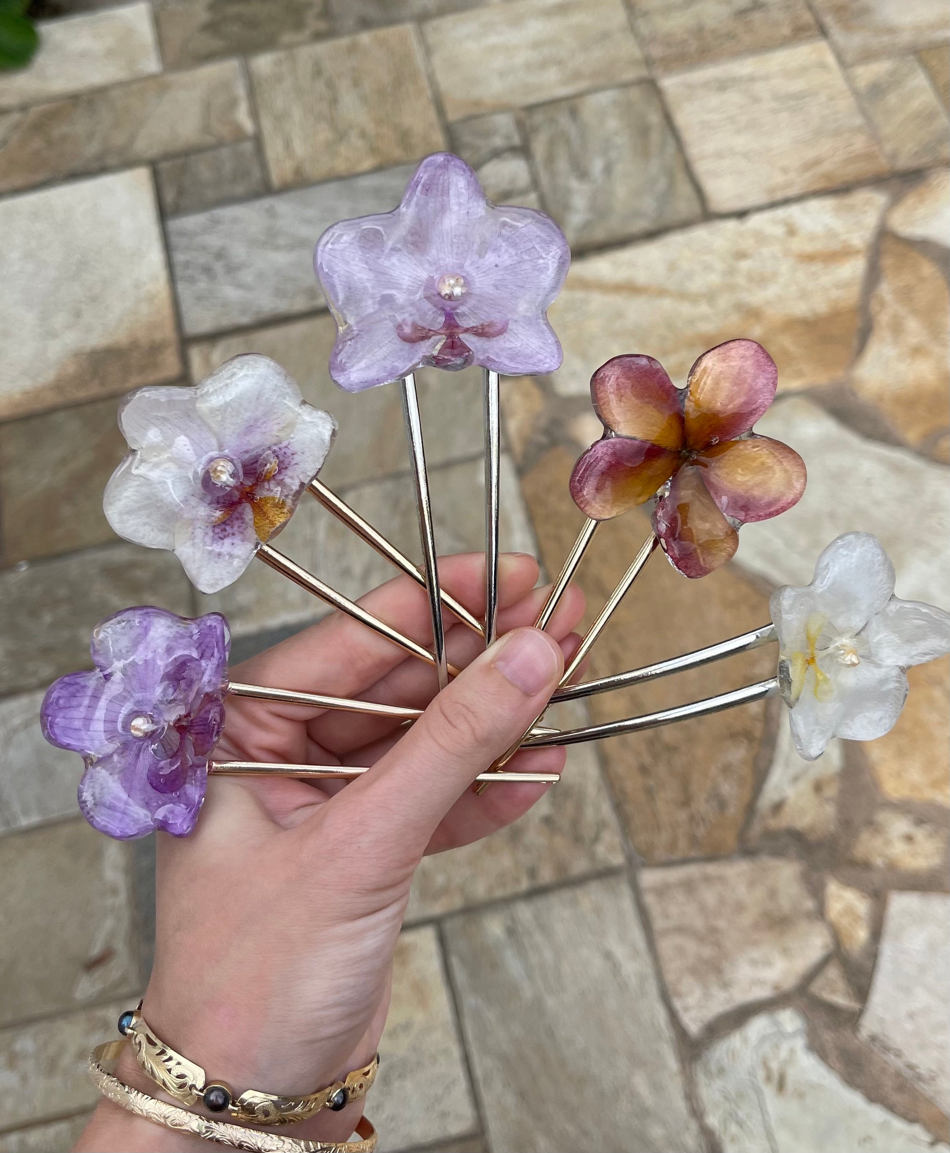 Hair pins can be in any orchid/plumeria color. Refer to the photos to choose a color. Please add in the comment box a flower color and hair pin color.